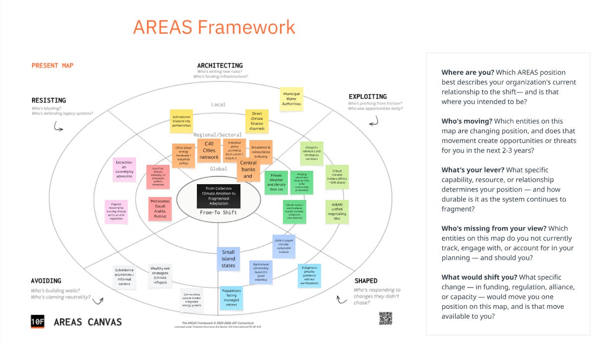 AREAS is a framework we developed for the 10F project to map strategic positioning during systemic transformation. It asks one question: given a particular shift that’s underway, what is this actor actually doing in response?